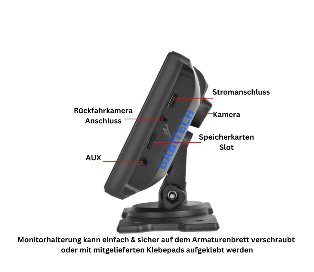 Eingebaute Kamera mit Videorecorder-Funktion: Aufzeichnung von Videos während der Fahrt in glasklarer Videoqualität. Wenn die TF-Karte( nicht in Lieferung erhalten) voll ist, löscht der Monitor die frühere manuelle/Timing-Aufzeichnungsdatei nacheinander und nimmt weiter auf. Bis zu 64G Speicherkarte.