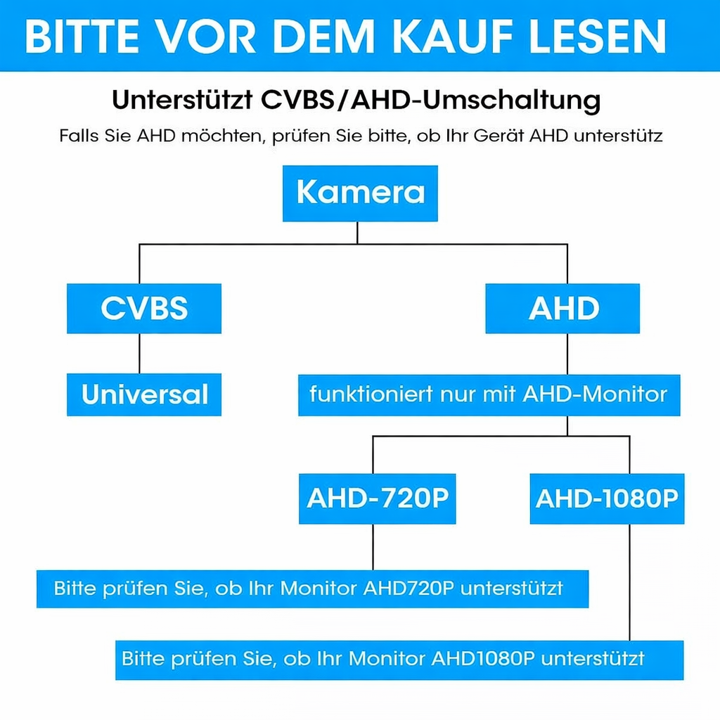 - Unterstützt CVBS (Standard) – funktioniert mit allen Monitoren